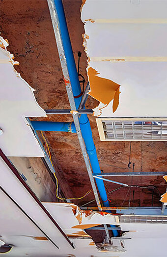 Urgent attention to roof plumbing leaks caused by damaged flashings, gutters, or downpipes during storms. Temporary solutions until permanent repair.
